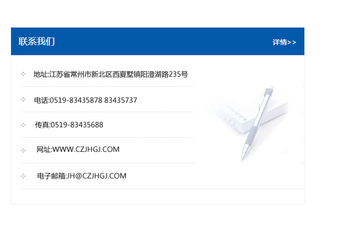 地址:常州市新北區友邦商務大廈1幢16、17層  電話:0519-85101652  傳真:0519-85112595  郵編:213022  網址:www.cz-jiayue_cn.scwwy.net  郵箱:xiajifengaa@163.com